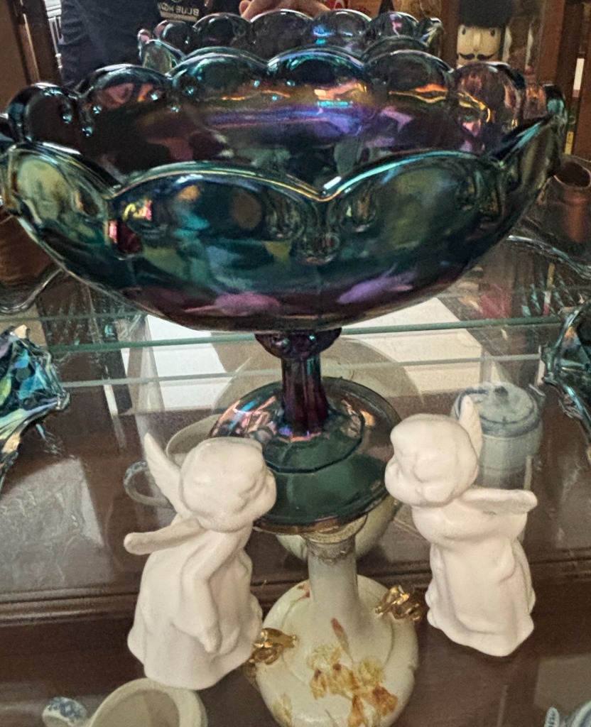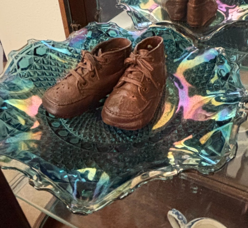 Carnival Glass Bowl with Bronzed Baby Shoes