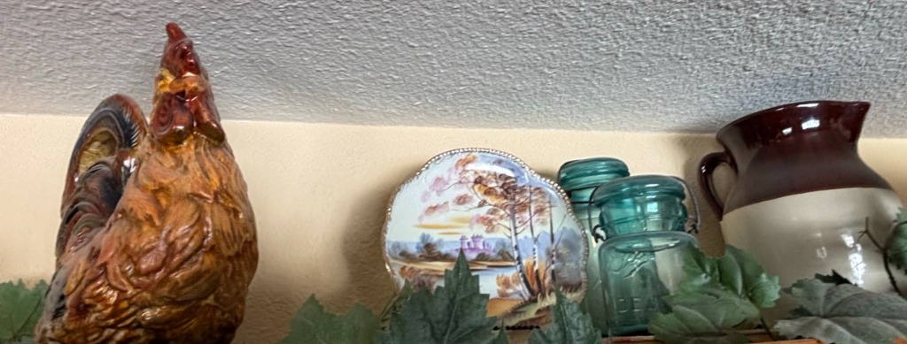 Ceramic Rooster Figurine, Decorative Plate, and Stoneware Pitcher