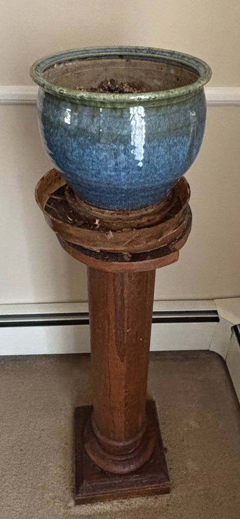 Large Blue and Green Glazed Ceramic Planter Pot with Wooden Pedestal Stand