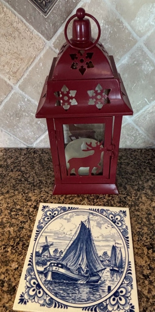 Red Metal Decorative Lantern with Deer Silhouette and Star/Heart Cut-outs