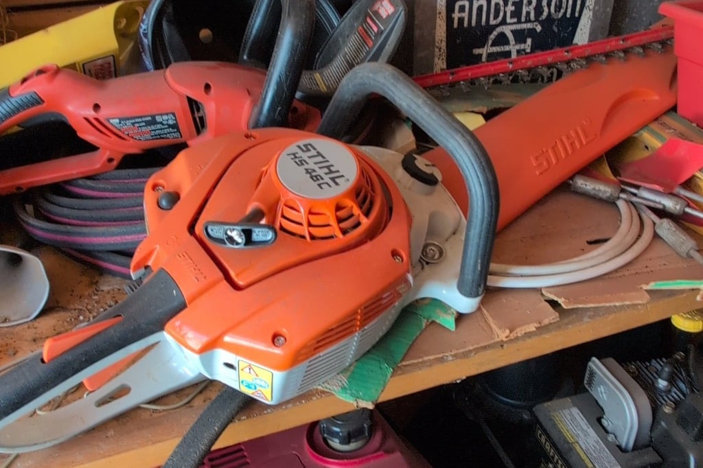 Assorted Garden Tools, Craftsman Snowblower, Stihl Chainsaw, and Blue Hand Truck