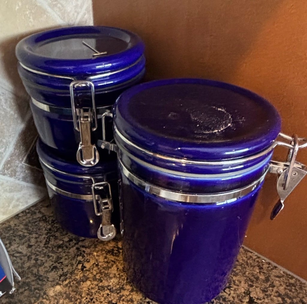 Set of 3 Cobalt Blue Ceramic Canisters with Hinged Lids