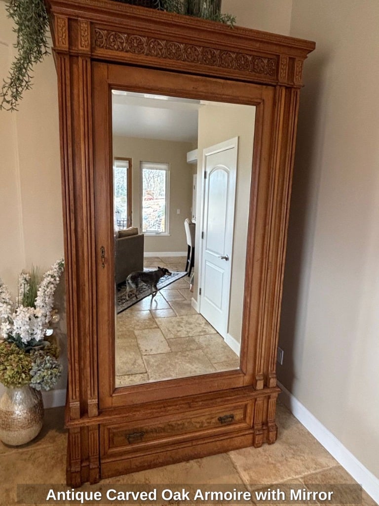 * Antique Carved Oak Armoire with Mirror