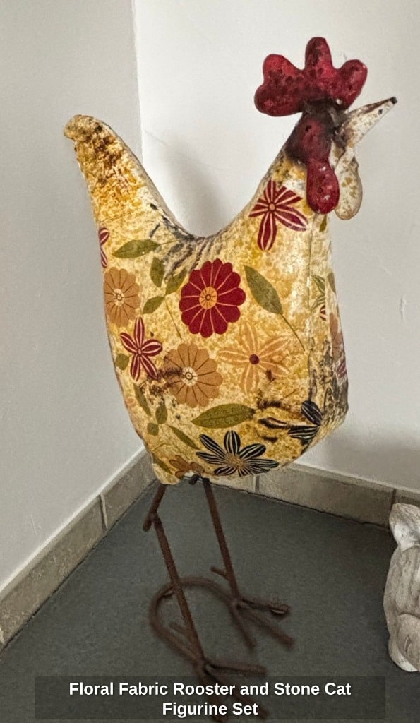 * Floral Fabric Rooster and Stone Cat Figurine Set