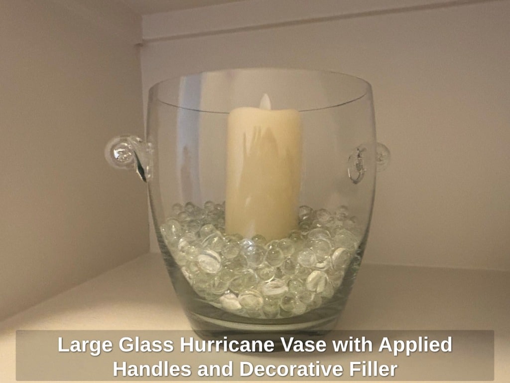 * Large Glass Hurricane Vase with Applied Handles and Decorative Filler