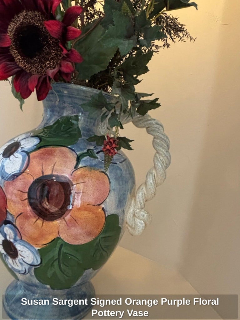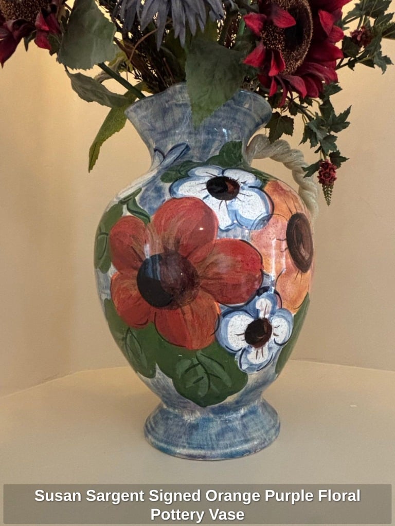 * Susan Sargent Signed Orange Purple Floral Pottery Vase