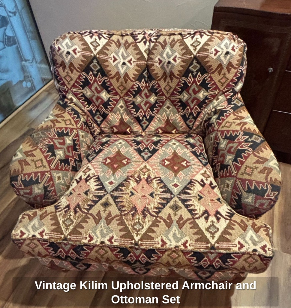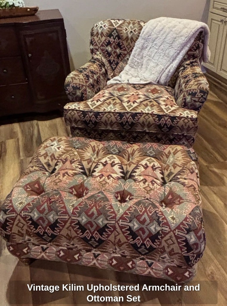 * Vintage Kilim Upholstered Armchair and Ottoman Set