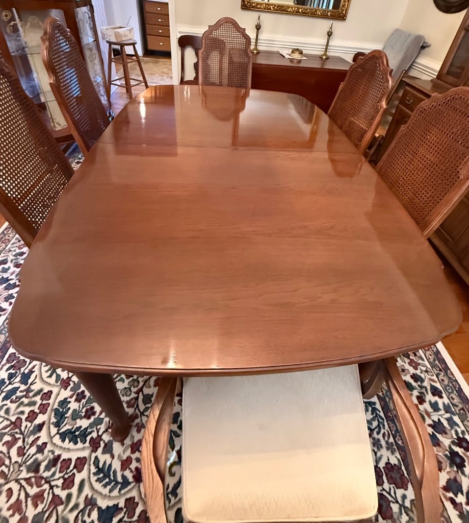 Thomasville Dining Table with 6 Tall Rattan Backed Chairs, plus Additional Leaf