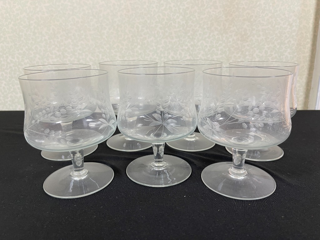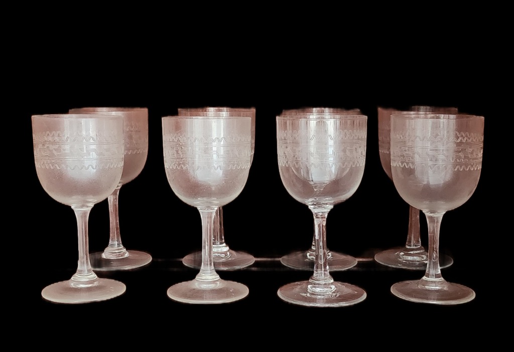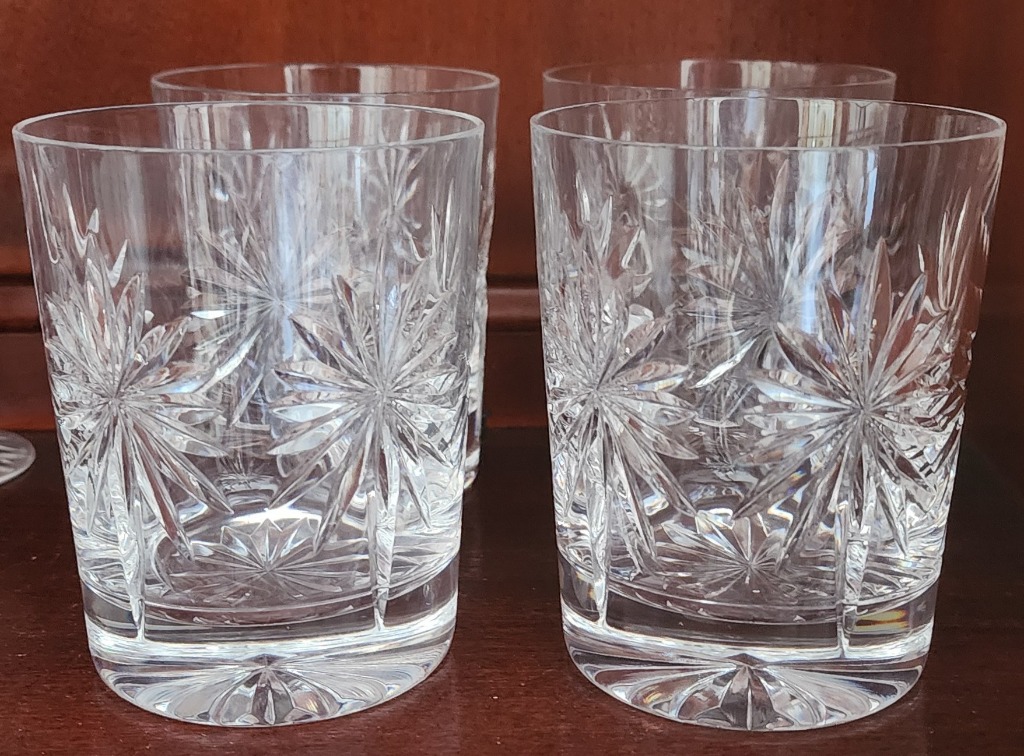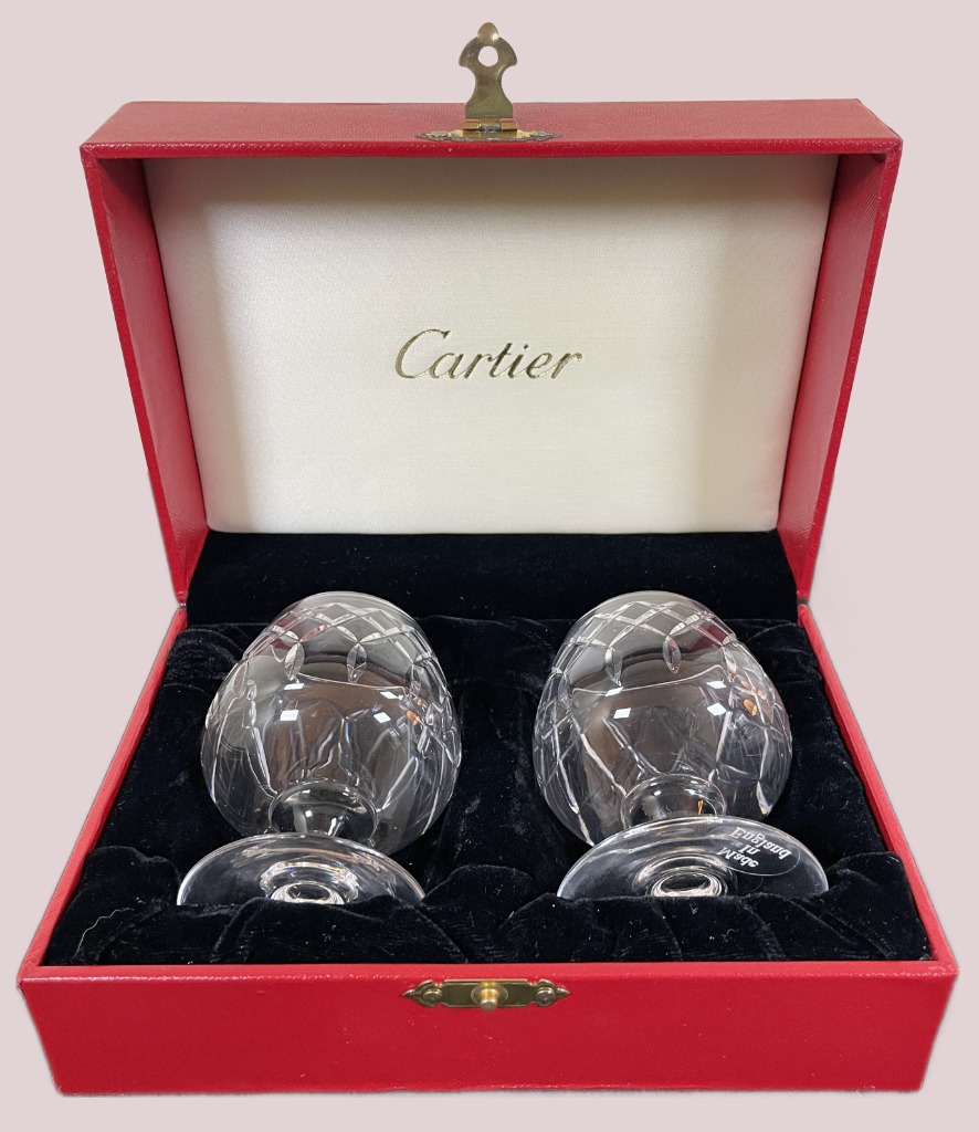 • Cut crystal tumblers, etched wine glasses, and Cartier brandy snifters