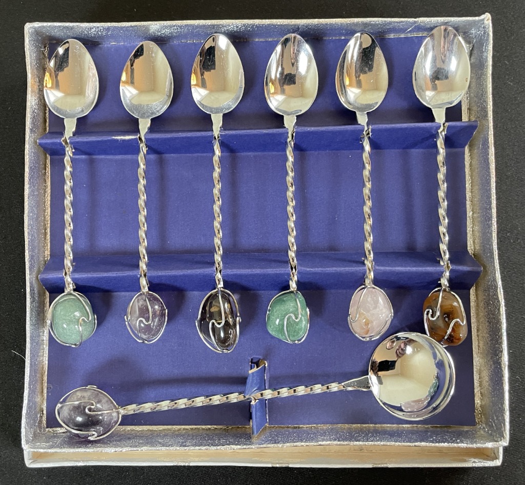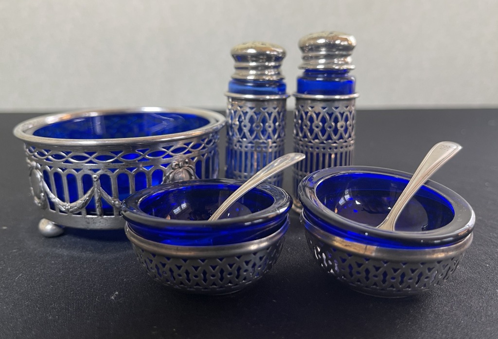 • Cobalt glass with sterling overlays and vintage silver accessories