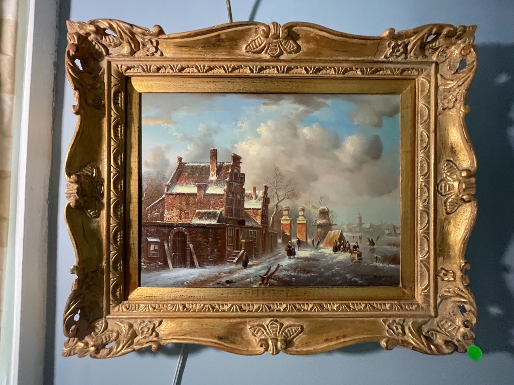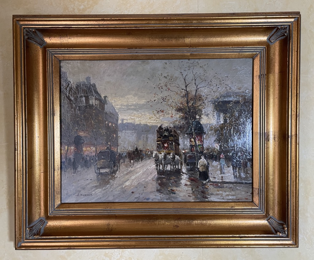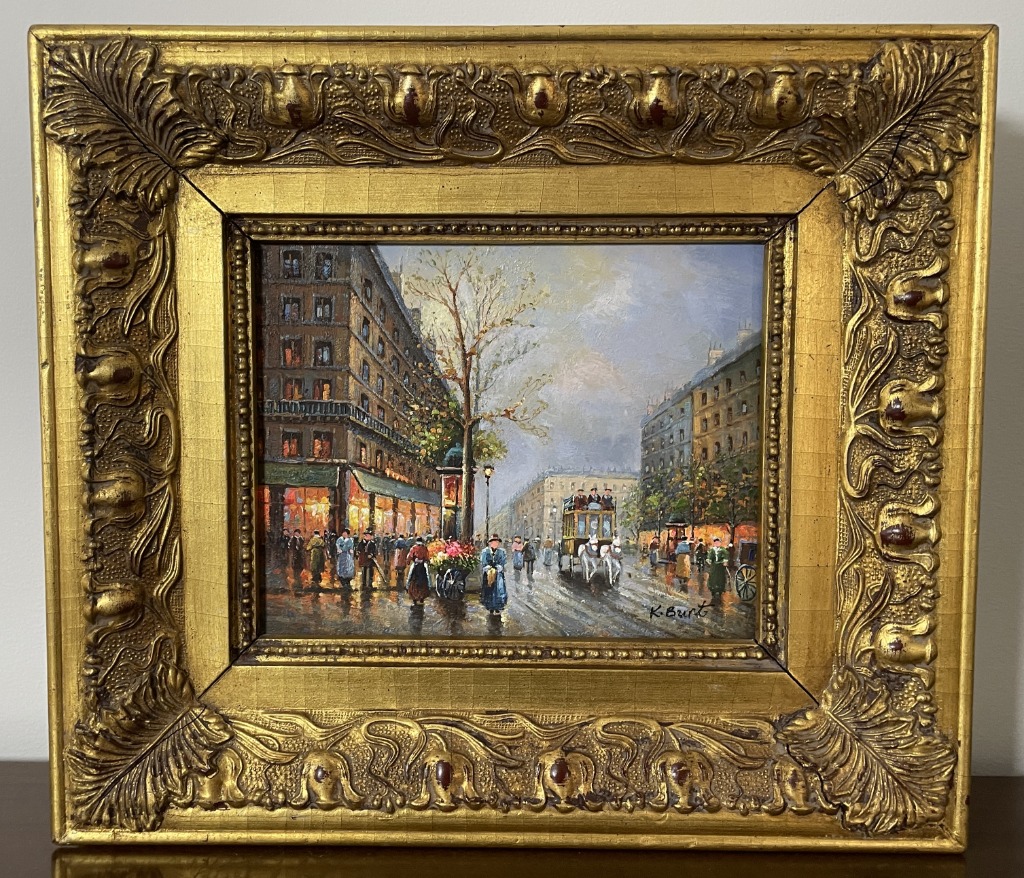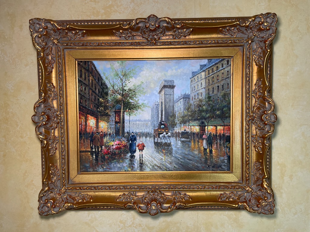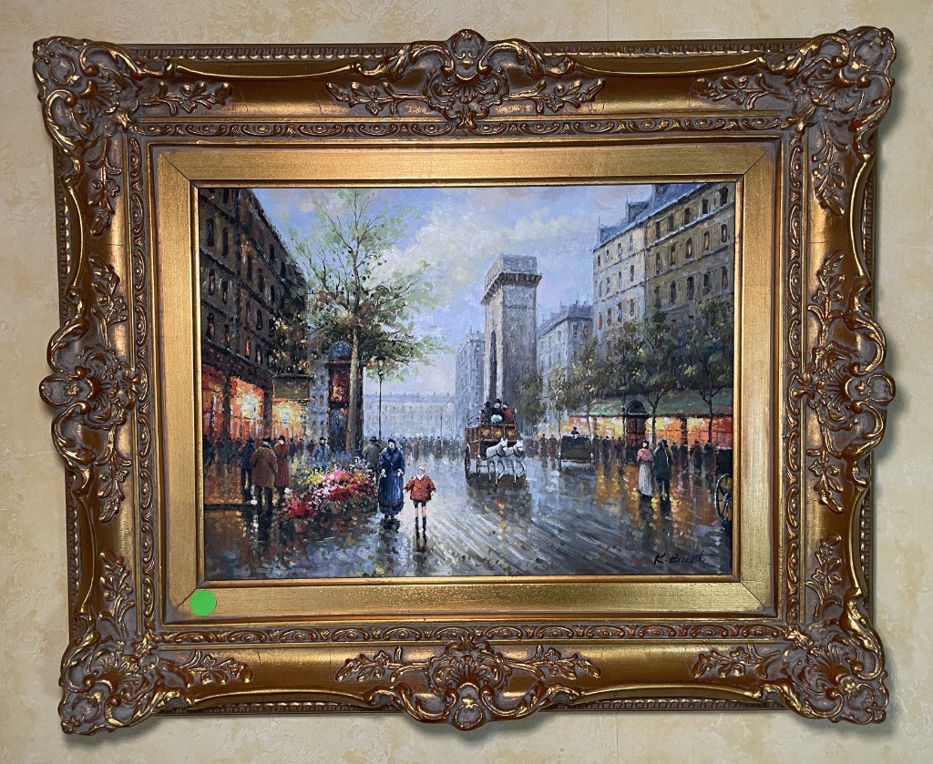 • Parisian street scene reproductions and antique framed oils