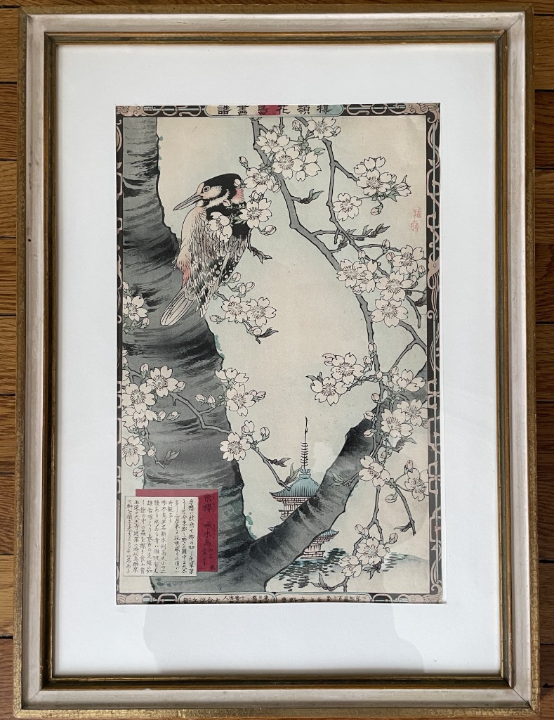 • Japanese woodblock print “Woodpecker and Weeping Cherry”